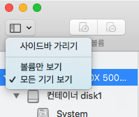 이상해서 이리저리 찾다가 Disk Utility 에서 해결책을 찾았다. Disk Utility 왼쪽 상단에 보면 보기 버튼이 있다.