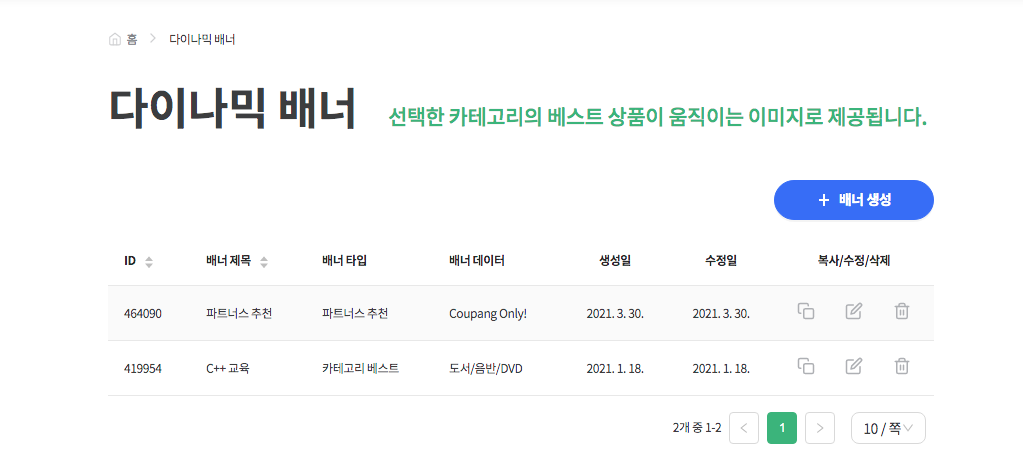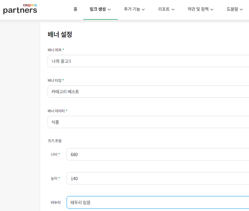 배너 생성 버튼을 누르고, 배너 생성을 위한 정보 몇가지만 선택해주고 배너생성 버튼만 누르면 끝!!