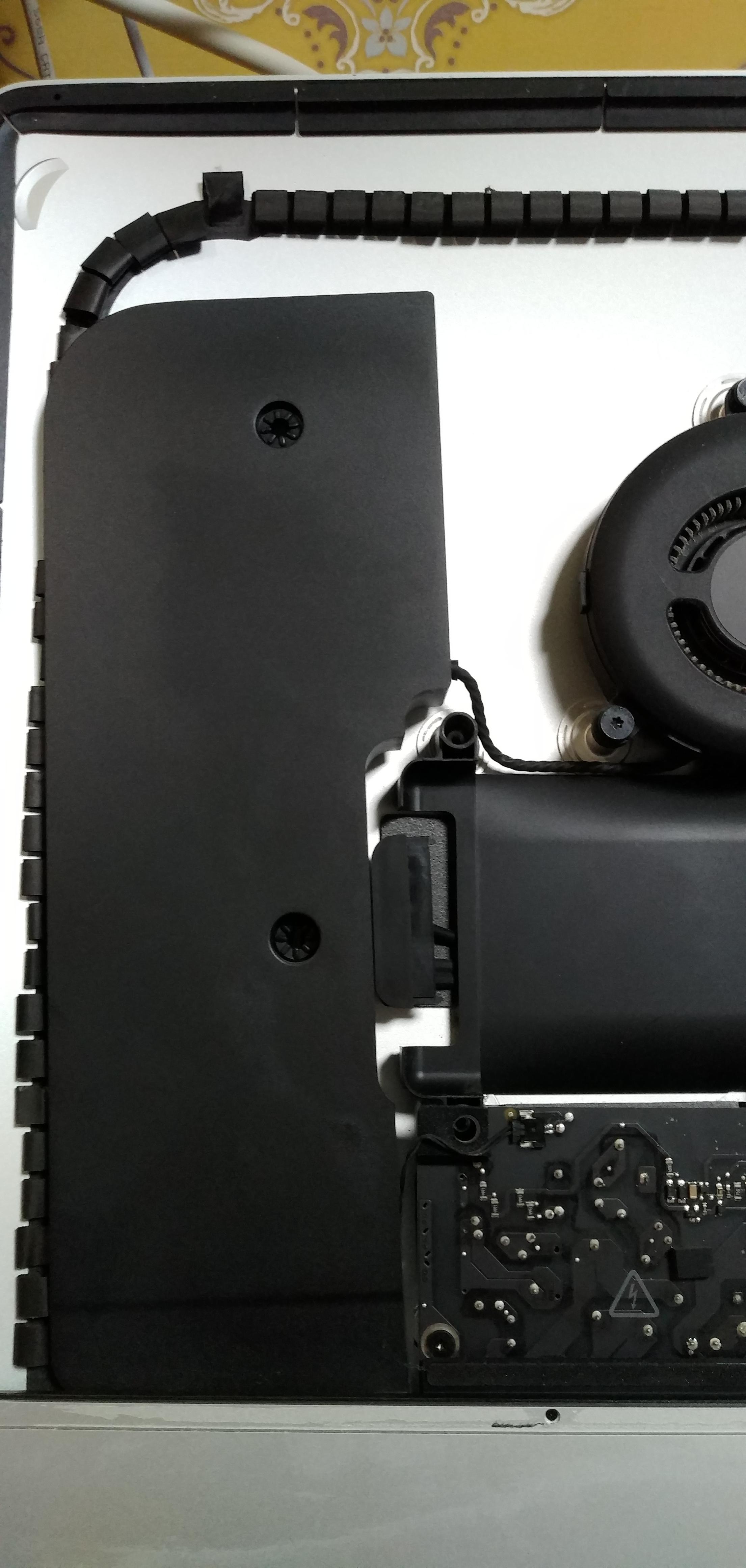 HDD가 끼워져 있을 때의 사진이 없다 ㅠ. 위 사진의 비어있는 커넥터가 SSD가 들어갈 곳이다. 왼쪽은 스피커 인데, 2개의 스크류만 분해하면 옆으로 살짝 밀 수 있다. 저 커넥터에 SSD를 연결하고, 아이맥 디스플레이를 붙이기 위한 스티커만 붙인 후 접합하면 끝!