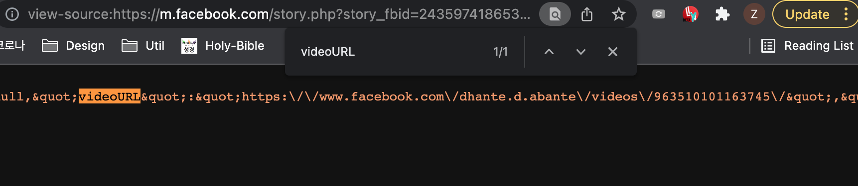 아래 이미지 처럼 페이지 소스가 나오는 곳에서 "videoURL" 을 검색한다.