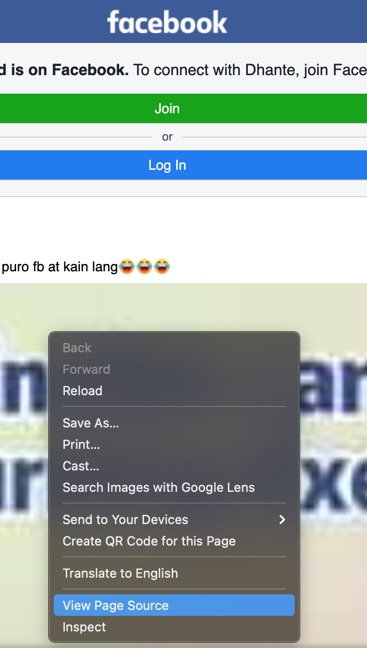 크롬 기준으로 페이스북 영상에서 오른쪽 버튼을 클릭하고 "View Page Source" 를 누른다.
