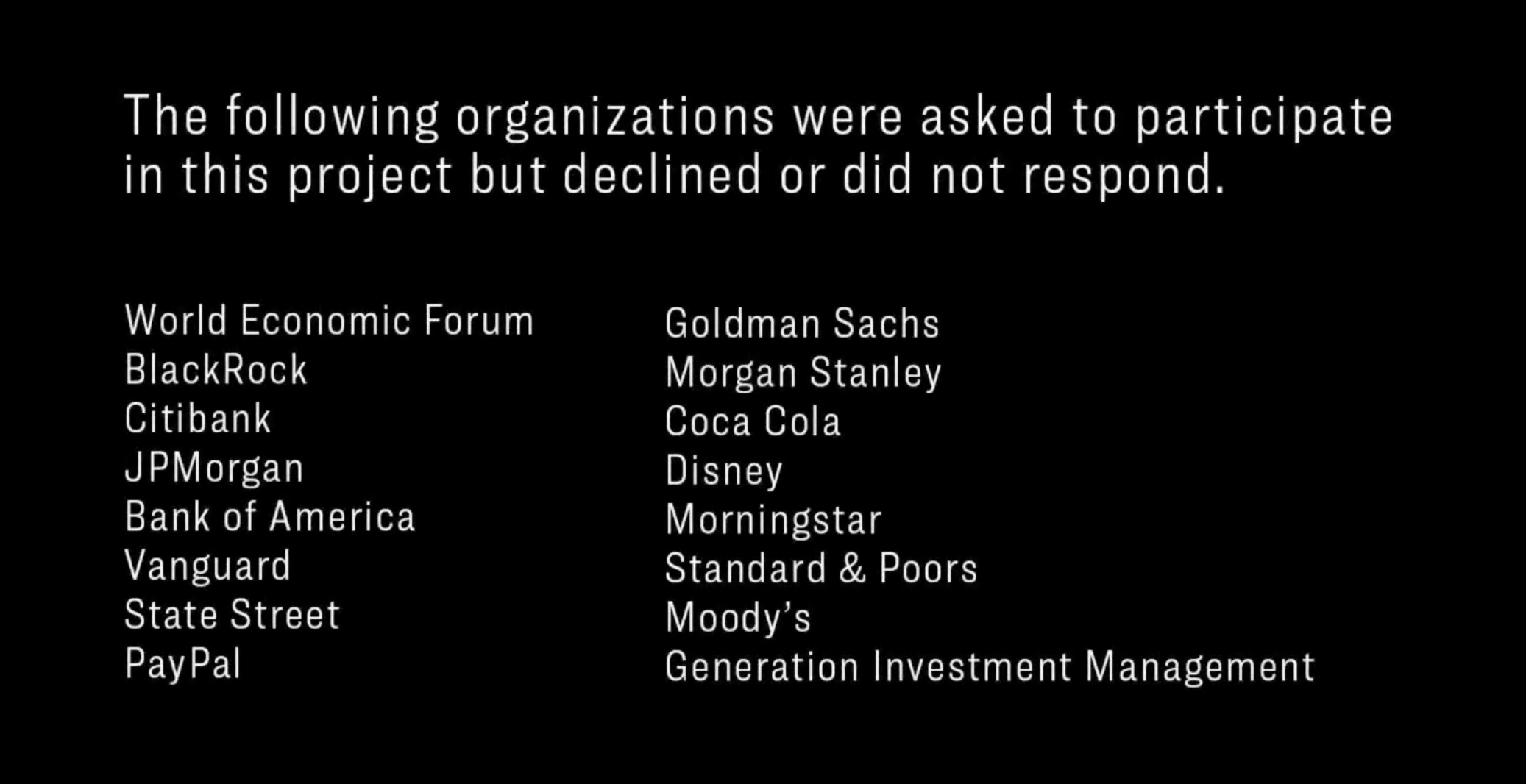BlackRock, StateStreet, Vanguard. 이들은 전부 합쳐 20조 달러 이상을 관리하고 있다. 세계 최대의 은행이 포함되고, 세계적 CEO, 정치 지도자들로 이뤄진 클럽도 포함한다. World Economic Forum. Climate Action 100+, GFANZ, NET ZERO ASSET.