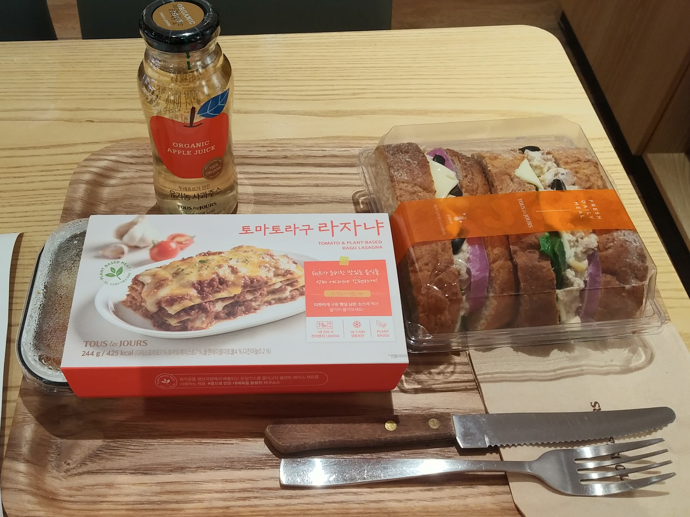 오늘의 메뉴는 토마토 라구 라자냐, 사과 주스, 통밀 튜나 샌드위치.