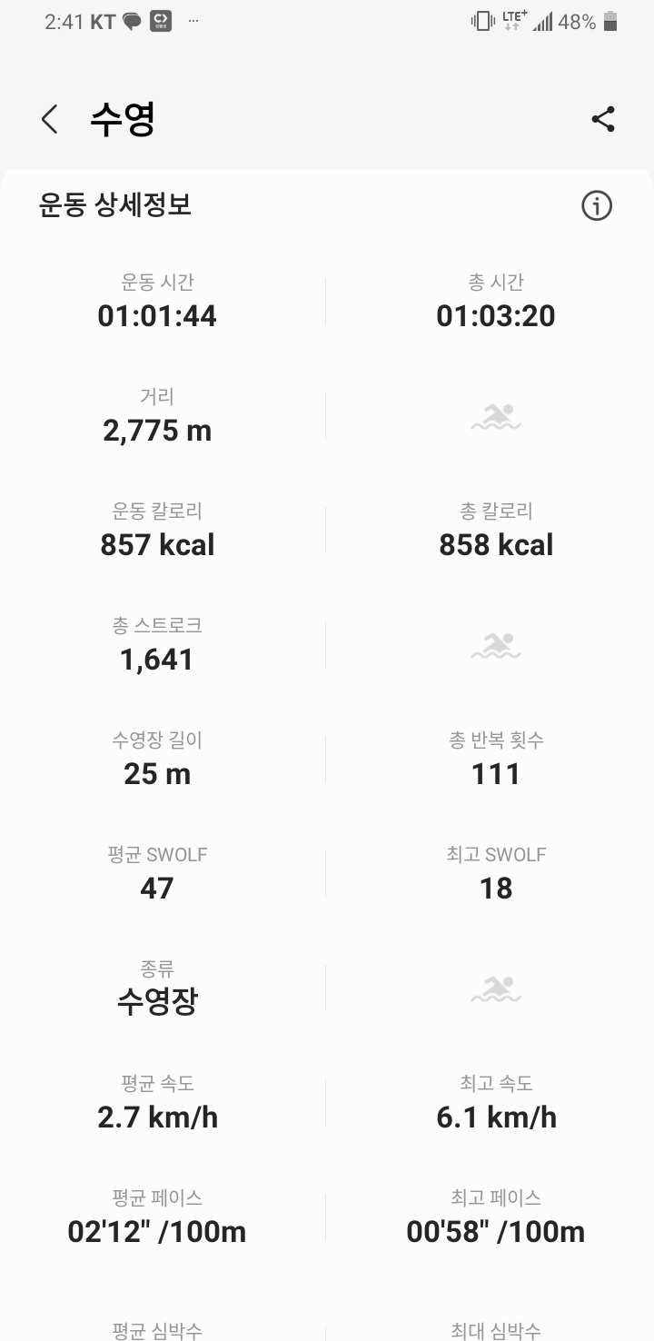 최고 SWOLF 18 이라고 나오는데, 수영장 거리가 25m 였기 때문에 잘 못 측정된 수치인 것 같습니다 ;