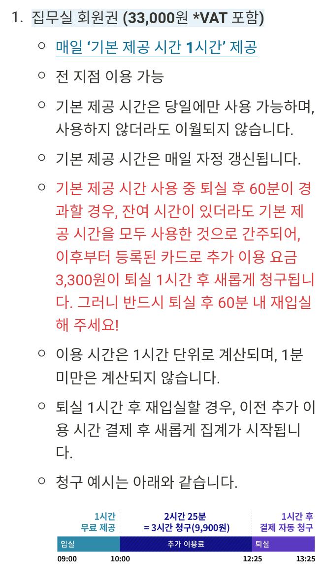 기본회원권의 경우에 기본으로 제공되는 60분 사용중 퇴실하고 1시간이 지나면 60분을 다 사용한 것으로 간주한다고 한다.. ㅠ 기본회원권 사용회원의 자리 점유를 방지하기 위한 것이라고 한다. 이유는 그럴수도 있겠다 싶지만.. 기본회원권 사용에 제약이 많다는 생각이 든다. 일이 있을 때마다 잠시 사용을 위해 기본사용권을 결제한 것이었는데.. 그런 식의 사용은 어려운 것이었다.