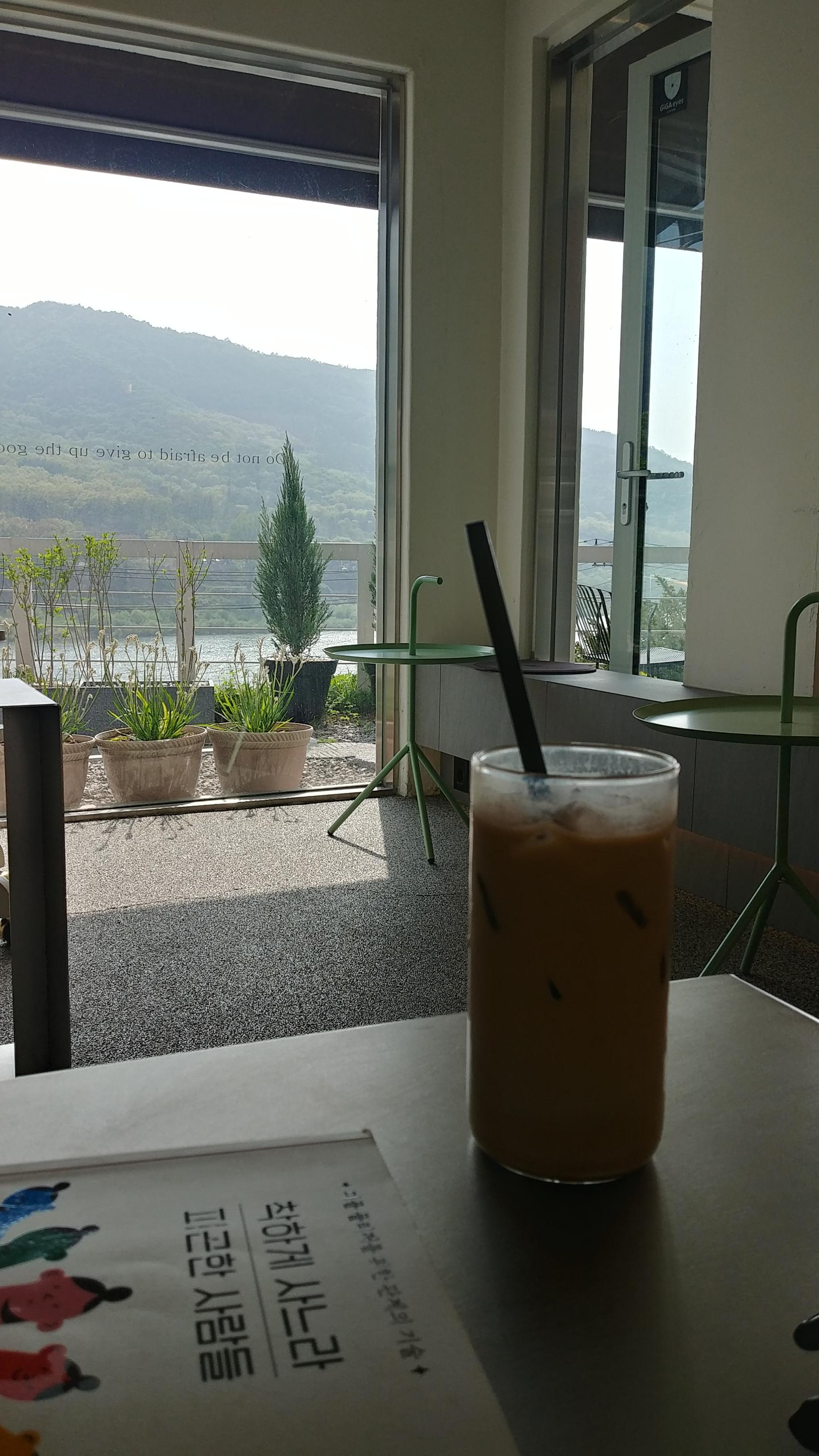 분당에서 다산생태공원으로 자전거를 타고 가다가 분위기가 좋아보여 들어온 커피숍입니다. 날씨가 더웠기 때문에 시원한 아이스카페라떼를 주문하였습니다. 7000원으로 가격대는 좀 있었지만 뷰값이라고 생각하시면 됩니다. ㅎㅎ