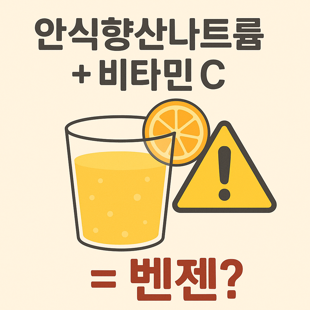 문제는 안식향산나트륨이 **비타민 C(아스코르빈산, E300)**와 함께 있을 때입니다.